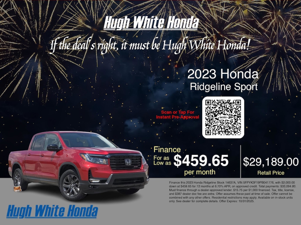 If you're ready to finance a used Honda vehicle near Columbus, Grove City, Hilliard, and Canal Winchester, Hugh White Honda is thrilled to offer you a competitive finance offer on this 2023 Honda Ridgeline Sport. Use our car payment calculator to estimate your monthly payments or see how the monthly payment of $459.65 is calculated for well-qualified buyers shopping at Hugh White Honda with Tier 1 credit: