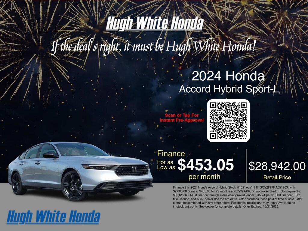 Disclaimer: Finance this 2024 Honda Accord Hybrid Stock H1091A, VIN 1HGCY2F77RA051963, with $2,000.00 down at $453.05 for 72 months at 6.72% APR, on approved credit. Total payments: $32,619.60. Must finance through a dealer-approved lender. $15.74 per $1,000 financed. Tax, title, license, and $387 dealer doc fee are extra. Offer assumes these paid at time of sale. Offer cannot be combined with any other offers. Residential restrictions may apply. Available on in-stock units only. See dealer for complete details. Offer Expires: 10/31/2025.