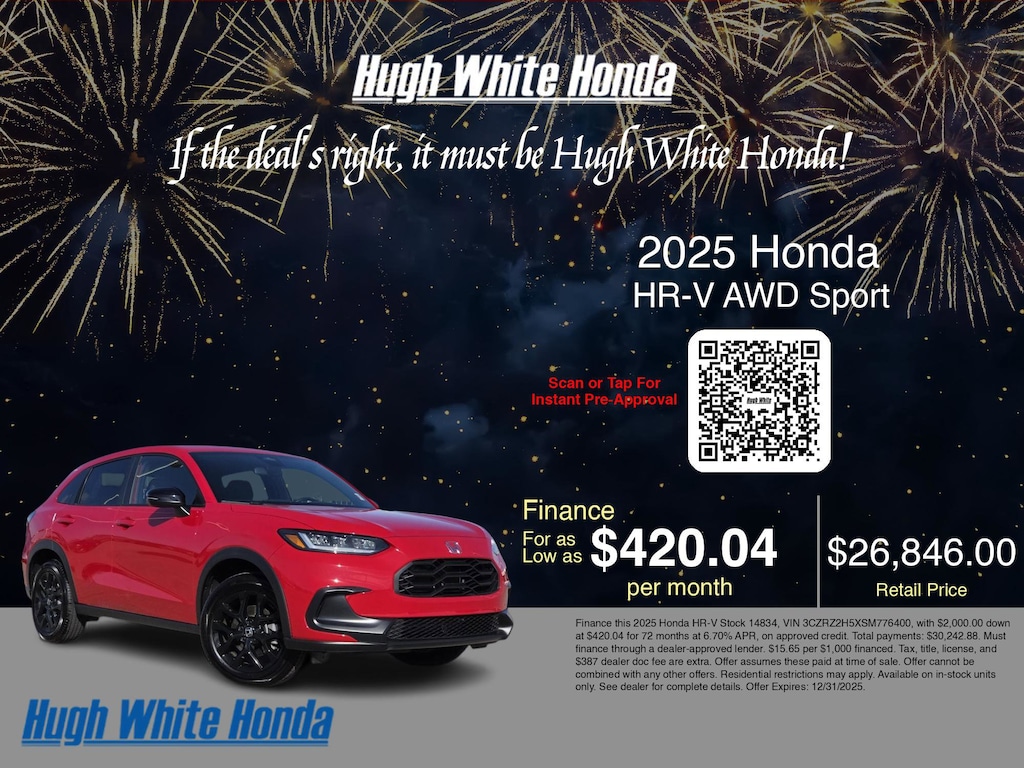 The Hugh White Honda used car dealership in Central Ohio is an easy drive or fly in from anywhere in the United States. Your 2025 Honda HR-V AWD Sport will be waiting for your test drive and/or shipping instructions.