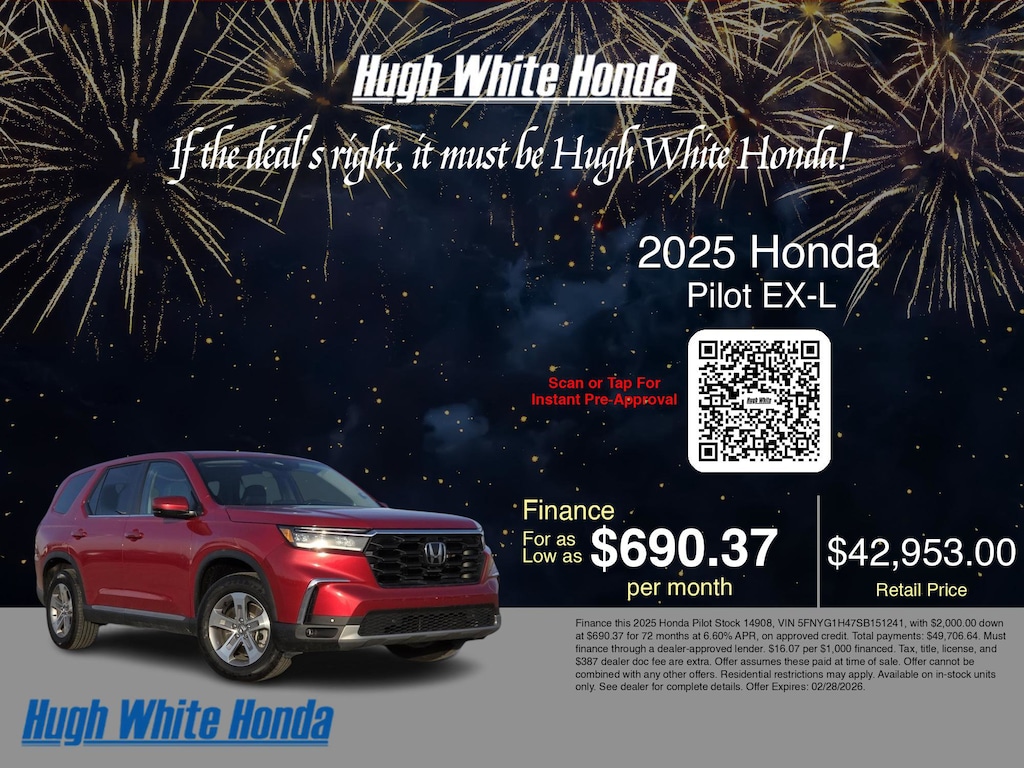 If you're ready to finance a Honda Certified used car near Columbus, Grove City, Hilliard, and Canal Winchester, Hugh White Honda is thrilled to offer you a competitive finance offer on this 2025 Honda Pilot EX-L. Use our car payment calculator to estimate your car payment, or see how the monthly payment of $690.37 is calculated for well-qualified buyers shopping at Hugh White Honda with Tier 1 credit: