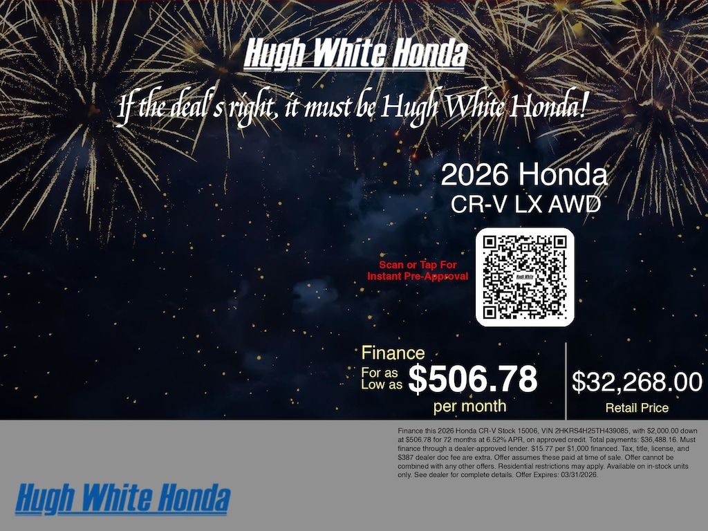 Disclaimer: Finance this 2026 Honda CR-V Stock 15006, VIN 2HKRS4H25TH439085, with $2,000.00 down at $506.78 for 72 months at 6.52% APR, on approved credit. Total payments: $36,488.16. Must finance through a dealer-approved lender. $15.77 per $1,000 financed. Tax, title, license, and $387 dealer doc fee are extra. Offer assumes these paid at time of sale. Offer cannot be combined with any other offers. Residential restrictions may apply. Available on in-stock units only. See dealer for complete details. Offer Expires: 03/31/2026.