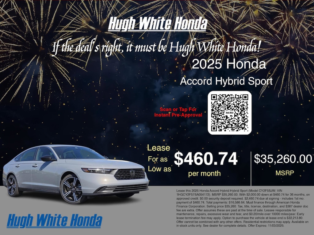 If the deal's right, it must be Hugh White! Stop in today and see why thousands of customers have trusted us with their new vehicles over the years! 2025 Honda Accord Hybrid Urban Gray