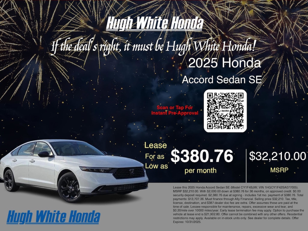 If the deal's right, it must be Hugh White! Stop in today and see why thousands of customers have trusted us with their new vehicles over the years! 2025 Honda Accord Platinum White Pearl