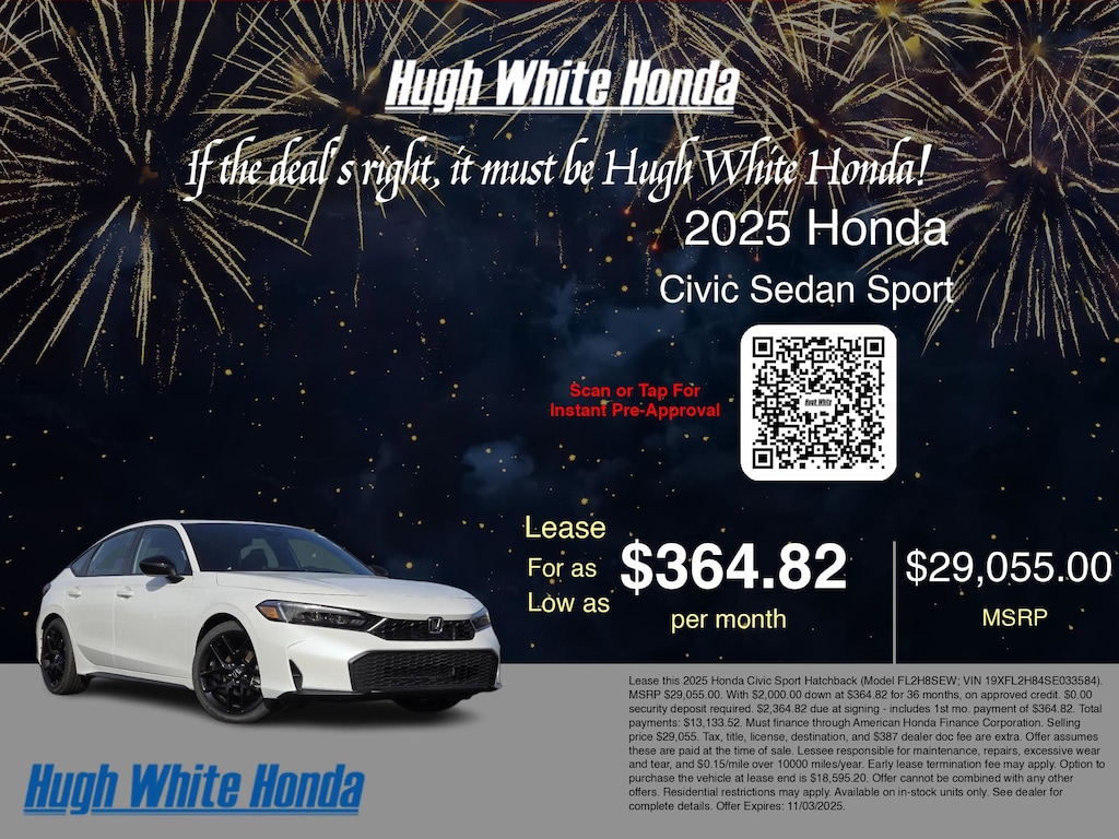 If the deal's right, it must be Hugh White! Stop in today and see why thousands of customers have trusted us with their new vehicles over the years! 2025 Honda Civic Platinum White Pearl