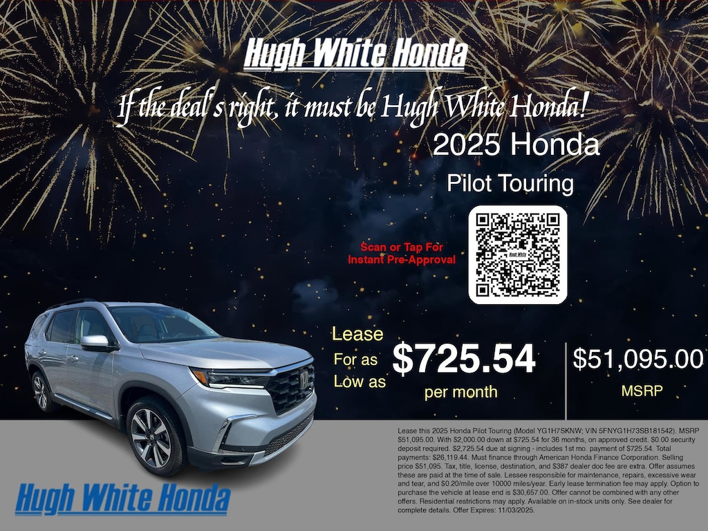If the deal's right, it must be Hugh White! Stop in today and see why thousands of customers have trusted us with their new vehicles over the years! 2025 Honda Pilot Lunar Silver Metallic