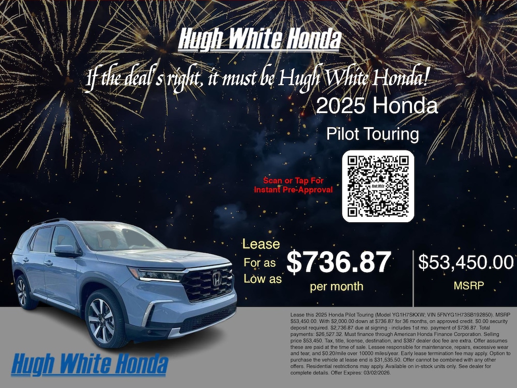 If the deal's right, it must be Hugh White! Stop in today and see why thousands of customers have trusted us with their new vehicles over the years! 2025 Honda Pilot Sonic Gray Pearl