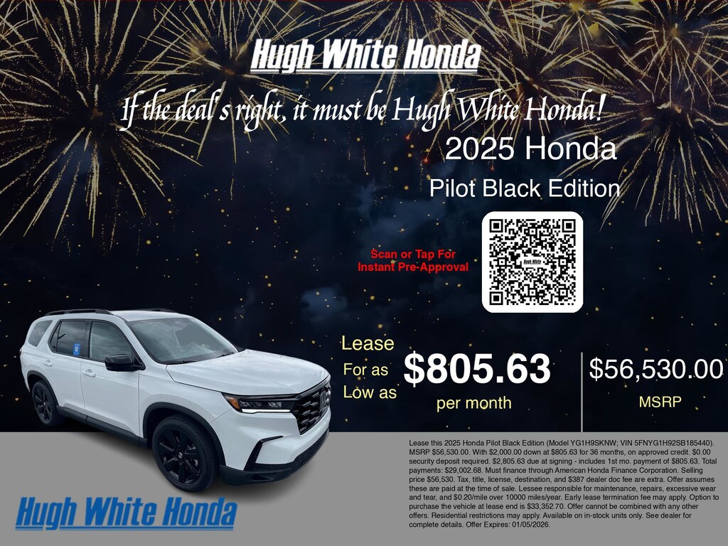 If the deal's right, it must be Hugh White! Stop in today and see why thousands of customers have trusted us with their new vehicles over the years! 2025 Honda Pilot Platinum White Pearl