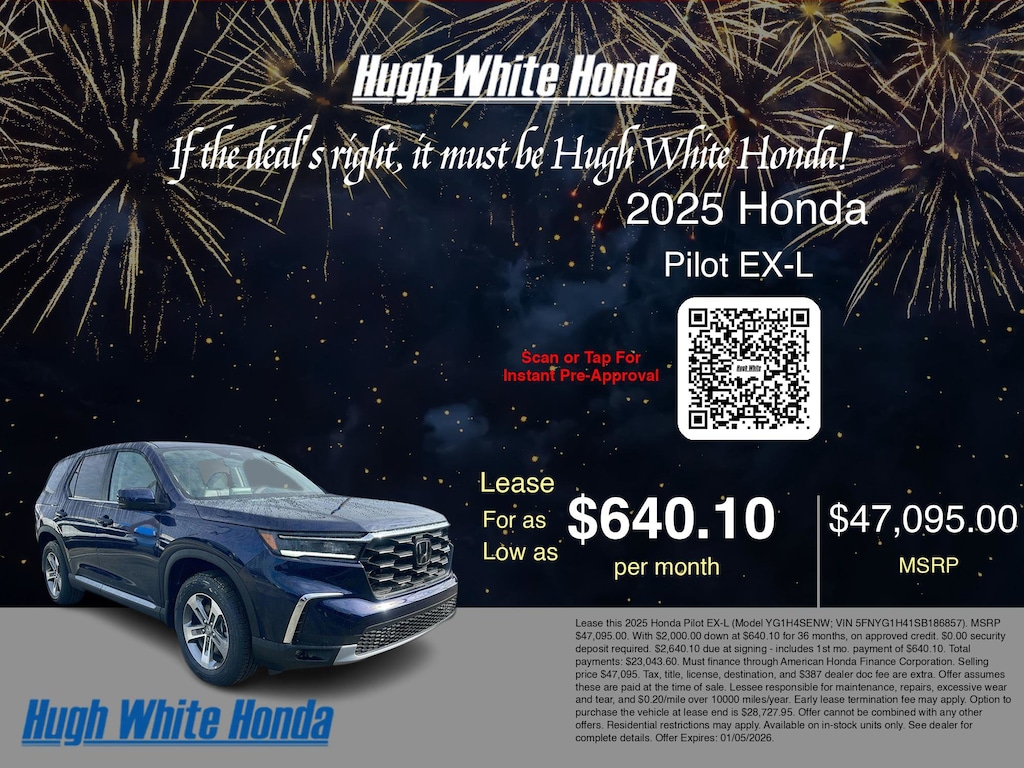 If the deal's right, it must be Hugh White! Stop in today and see why thousands of customers have trusted us with their new vehicles over the years! 2025 Honda Pilot Obsidian Blue Pearl