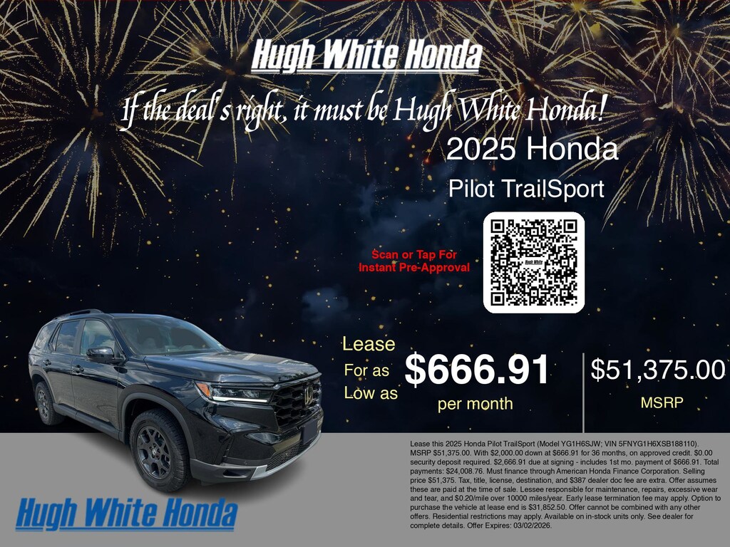 If the deal's right, it must be Hugh White! Stop in today and see why thousands of customers have trusted us with their new vehicles over the years! 2025 Honda Pilot Crystal Black Pearl