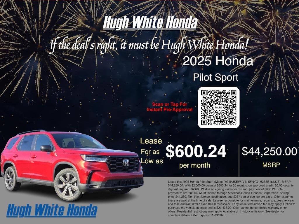If the deal's right, it must be Hugh White! Stop in today and see why thousands of customers have trusted us with their new vehicles over the years! 2025 Honda Pilot Radiant Red Metallic II