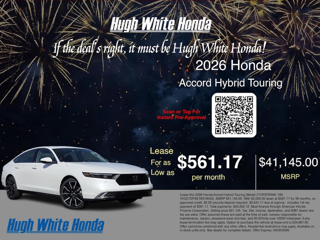 If the deal's right, it must be Hugh White! Stop in today and see why thousands of customers have trusted us with their new vehicles over the years! 2026 Honda Accord Hybrid Platinum White Pearl
