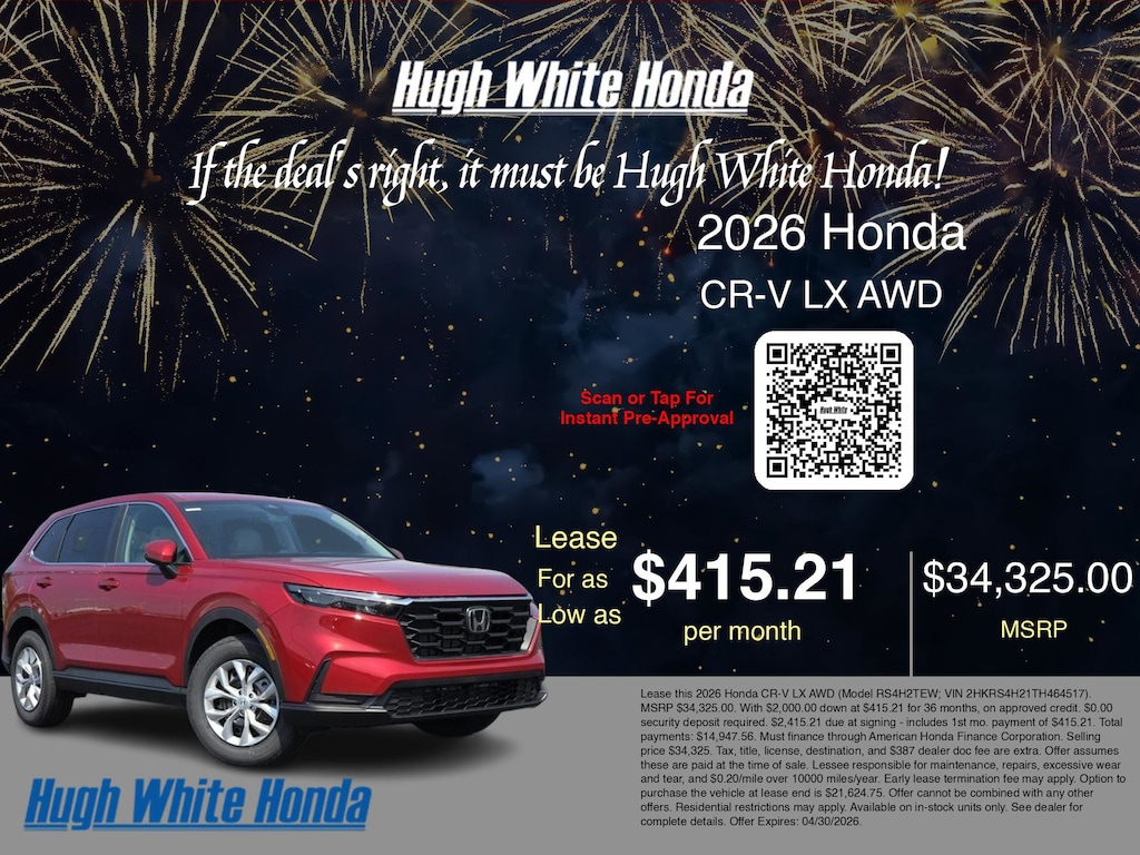 If the deal's right, it must be Hugh White! Stop in today and see why thousands of customers have trusted us with their new vehicles over the years! 2026 Honda CR-V Radiant Red Metallic