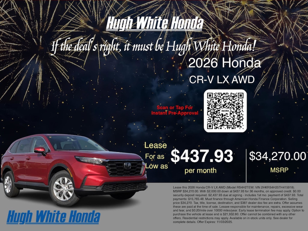 If the deal's right, it must be Hugh White! Stop in today and see why thousands of customers have trusted us with their new vehicles over the years! 2026 Honda CR-V Radiant Red Metallic