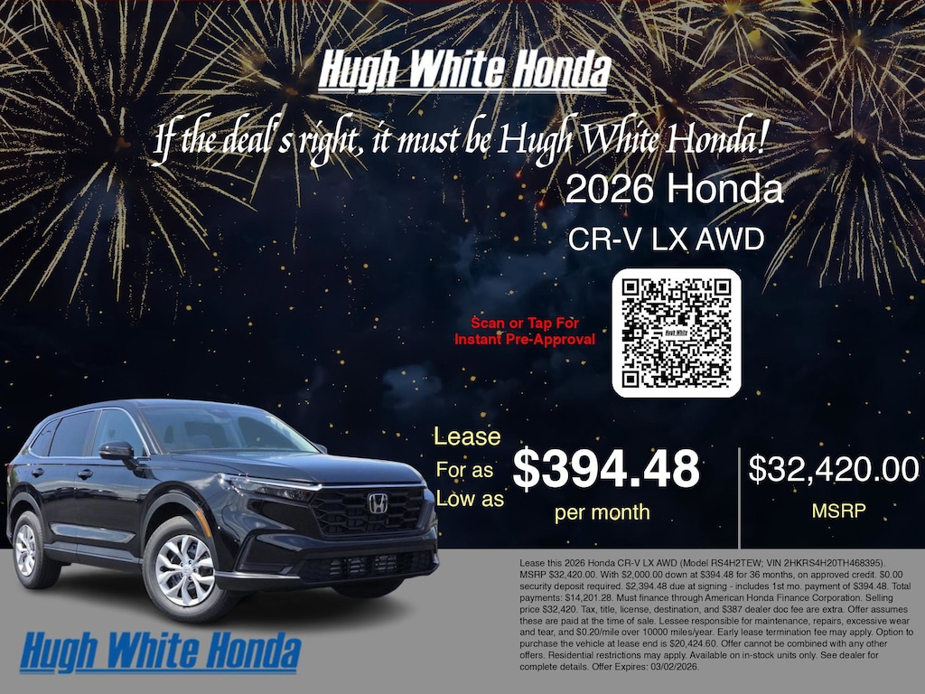 If the deal's right, it must be Hugh White! Stop in today and see why thousands of customers have trusted us with their new vehicles over the years! 2026 Honda CR-V Crystal Black Pearl