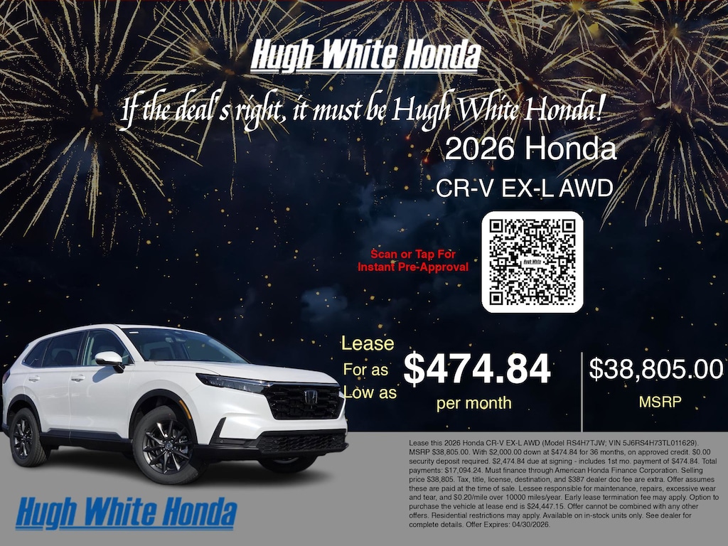 If the deal's right, it must be Hugh White! Stop in today and see why thousands of customers have trusted us with their new vehicles over the years! 2026 Honda CR-V Platinum White Pearl