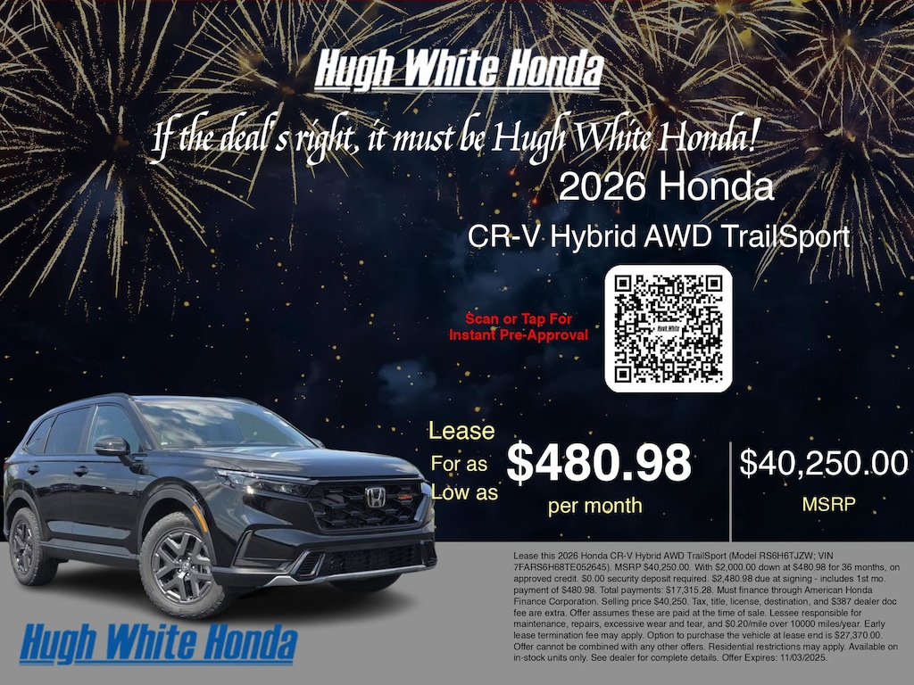 If the deal's right, it must be Hugh White! Stop in today and see why thousands of customers have trusted us with their new vehicles over the years! 2026 Honda CR-V Hybrid Crystal Black Pearl