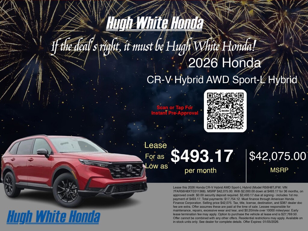 If the deal's right, it must be Hugh White! Stop in today and see why thousands of customers have trusted us with their new vehicles over the years! 2026 Honda CR-V Hybrid Radiant Red Metallic