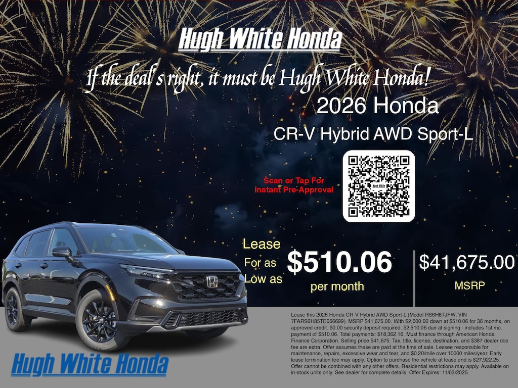 If the deal's right, it must be Hugh White! Stop in today and see why thousands of customers have trusted us with their new vehicles over the years! 2026 Honda CR-V Hybrid Crystal Black Pearl