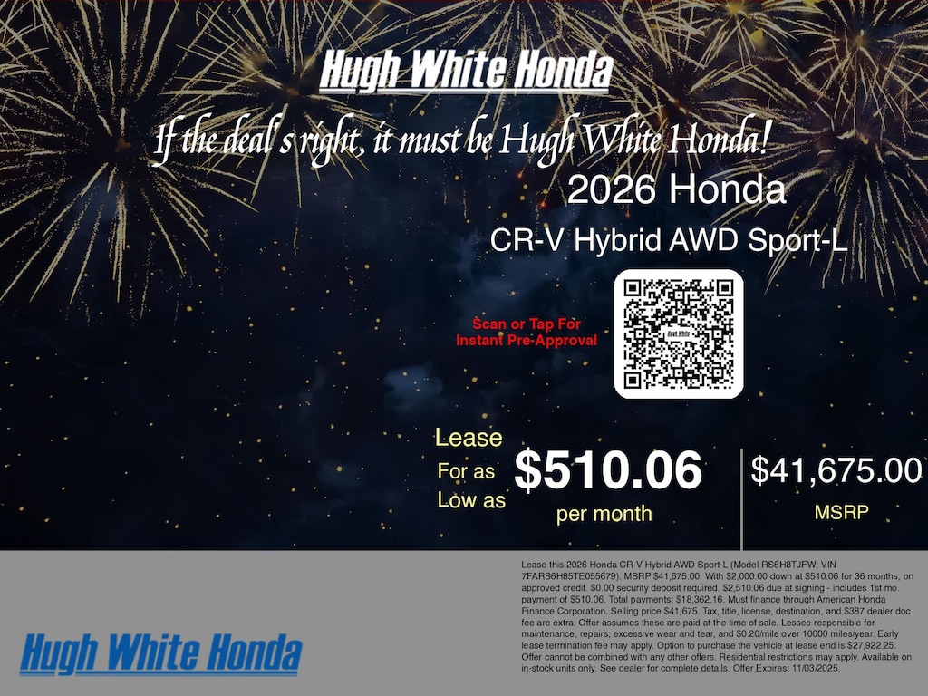 If the deal's right, it must be Hugh White! Stop in today and see why thousands of customers have trusted us with their new vehicles over the years! 2026 Honda CR-V Hybrid Crystal Black Pearl