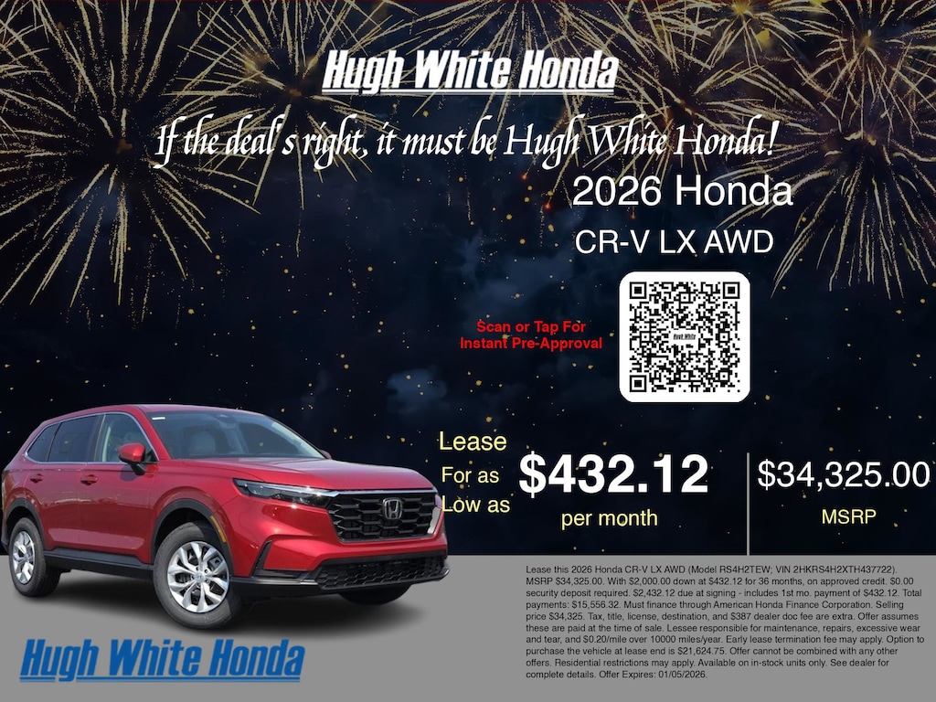 If the deal's right, it must be Hugh White! Stop in today and see why thousands of customers have trusted us with their new vehicles over the years! 2026 Honda CR-V Radiant Red Metallic