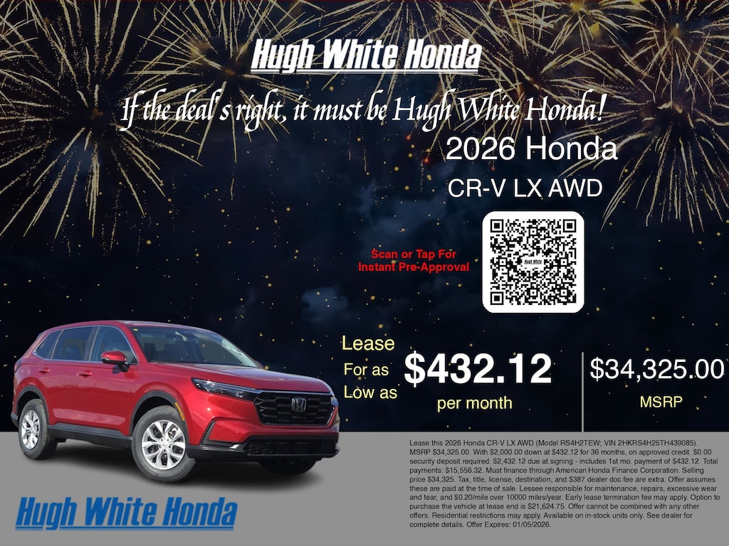 If the deal's right, it must be Hugh White! Stop in today and see why thousands of customers have trusted us with their new vehicles over the years! 2026 Honda CR-V Radiant Red Metallic