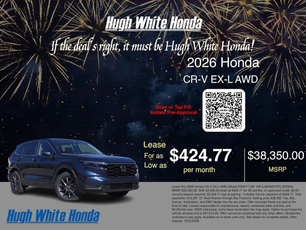 If the deal's right, it must be Hugh White! Stop in today and see why thousands of customers have trusted us with their new vehicles over the years! 2026 Honda CR-V Canyon River Blue Metallic