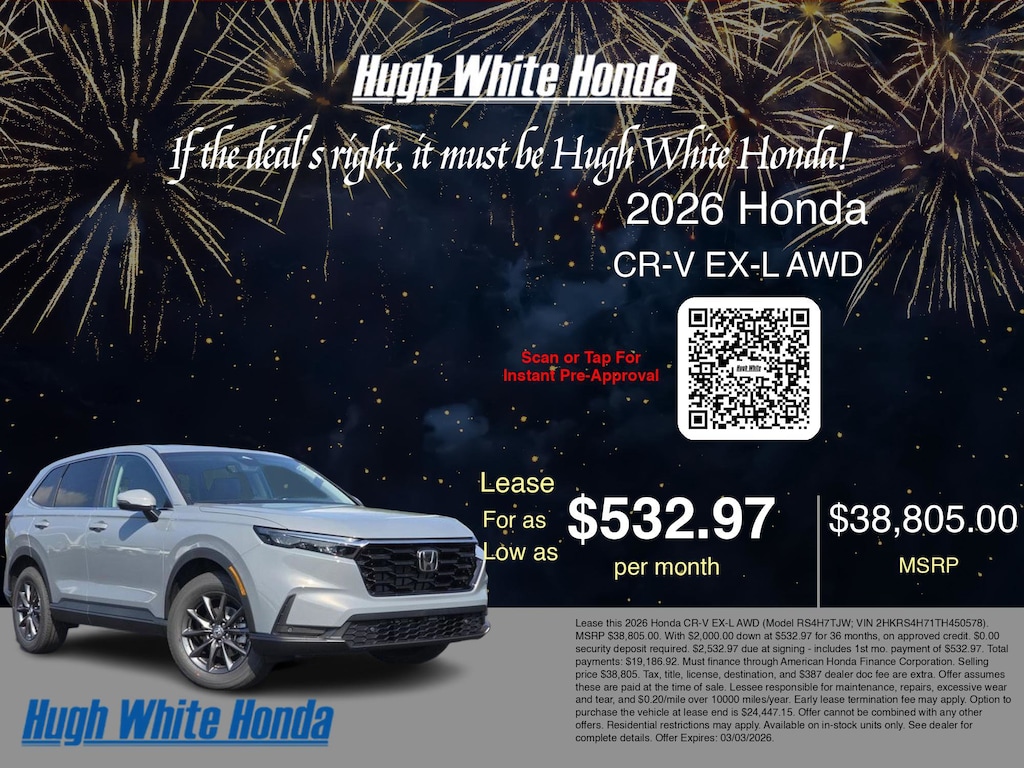 If the deal's right, it must be Hugh White! Stop in today and see why thousands of customers have trusted us with their new vehicles over the years! 2026 Honda CR-V Urban Gray Pearl