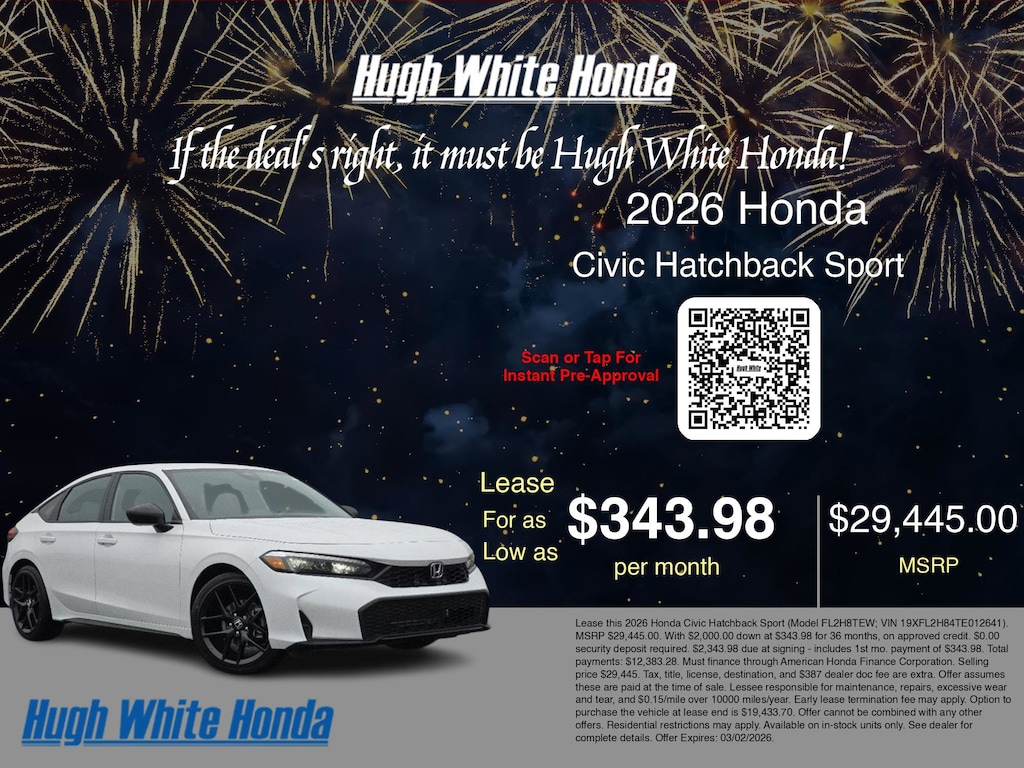 If the deal's right, it must be Hugh White! Stop in today and see why thousands of customers have trusted us with their new vehicles over the years! 2026 Honda Civic Platinum White Pearl