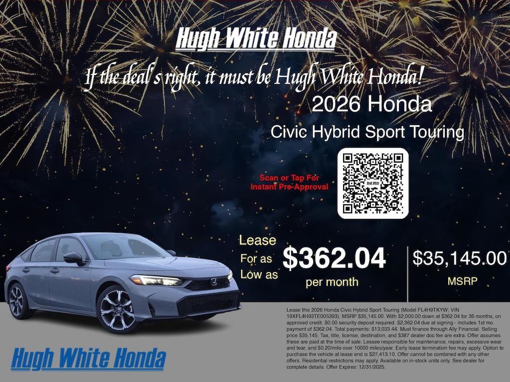 If the deal's right, it must be Hugh White! Stop in today and see why thousands of customers have trusted us with their new vehicles over the years! 2026 Honda Civic Hybrid Urban Gray Pearl