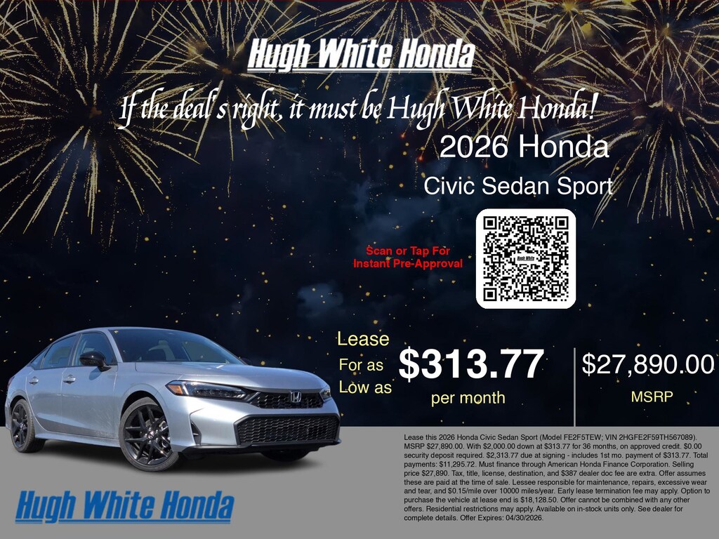 If the deal's right, it must be Hugh White! Stop in today and see why thousands of customers have trusted us with their new vehicles over the years! 2026 Honda Civic Solar Silver Metallic