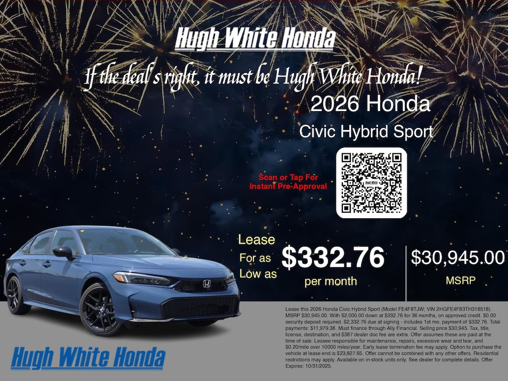 If the deal's right, it must be Hugh White! Stop in today and see why thousands of customers have trusted us with their new vehicles over the years! 2026 Honda Civic Hybrid Blue Lagoon Pearl