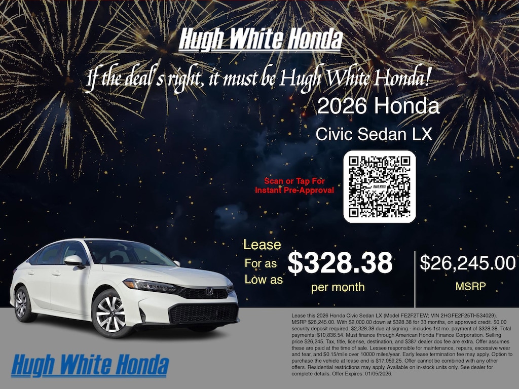If the deal's right, it must be Hugh White! Stop in today and see why thousands of customers have trusted us with their new vehicles over the years! 2026 Honda Civic Platinum White Pearl