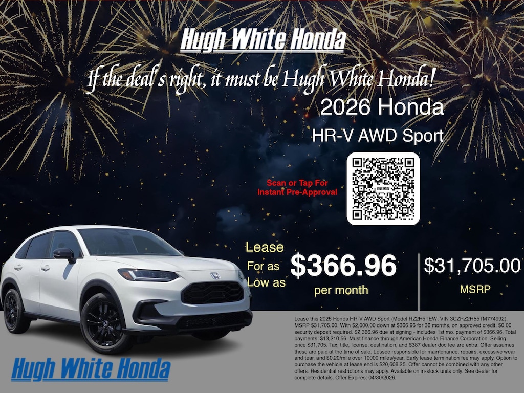 If the deal's right, it must be Hugh White! Stop in today and see why thousands of customers have trusted us with their new vehicles over the years! 2026 Honda HR-V Platinum White Pearl