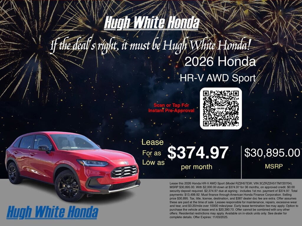 If the deal's right, it must be Hugh White! Stop in today and see why thousands of customers have trusted us with their new vehicles over the years! 2026 Honda HR-V Milano Red