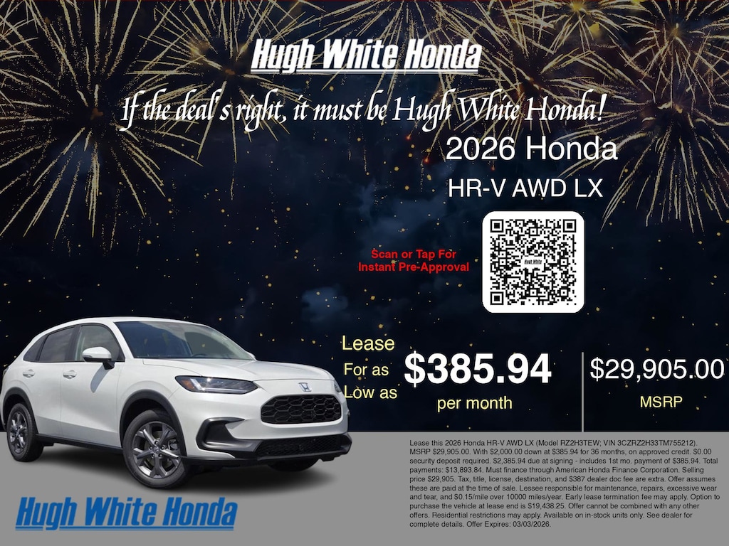 If the deal's right, it must be Hugh White! Stop in today and see why thousands of customers have trusted us with their new vehicles over the years! 2026 Honda HR-V Platinum White Pearl