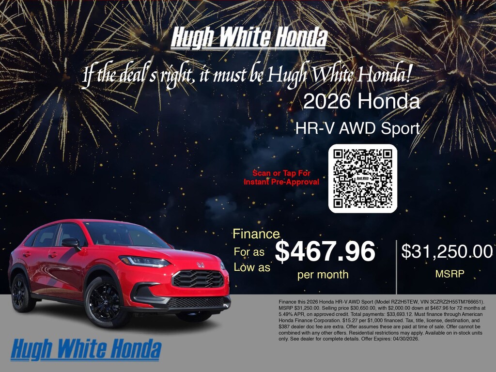 If the deal's right, it must be Hugh White! Stop in today and see why thousands of customers have trusted us with their new vehicles over the years! 2026 Honda HR-V Milano Red