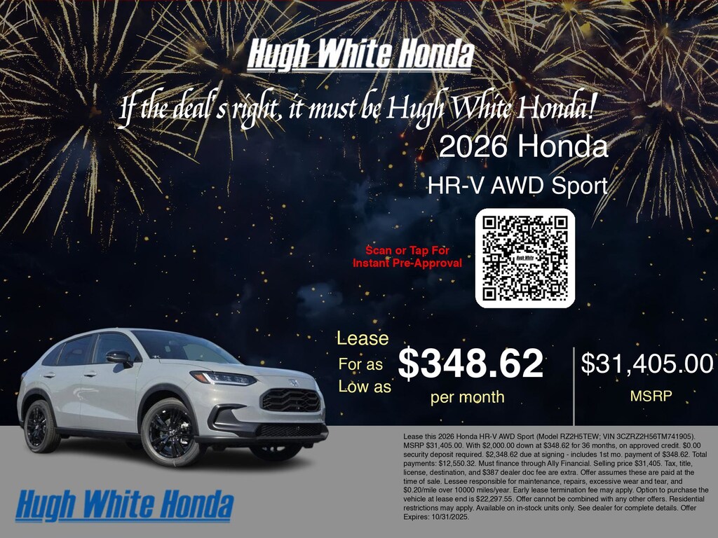 If the deal's right, it must be Hugh White! Stop in today and see why thousands of customers have trusted us with their new vehicles over the years! 2026 Honda HR-V Urban Gray Pearl