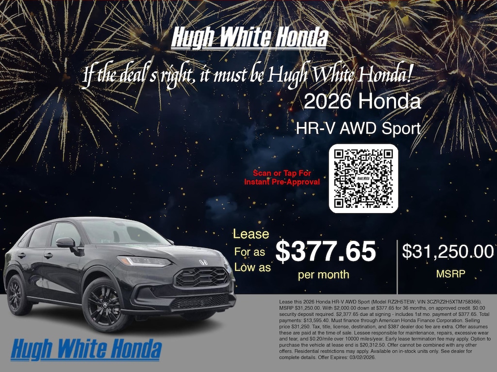 If the deal's right, it must be Hugh White! Stop in today and see why thousands of customers have trusted us with their new vehicles over the years! 2026 Honda HR-V Crystal Black Pearl