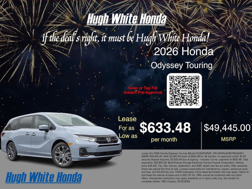 If the deal's right, it must be Hugh White! Stop in today and see why thousands of customers have trusted us with their new vehicles over the years! 2026 Honda Odyssey Sonic Gray Pearl