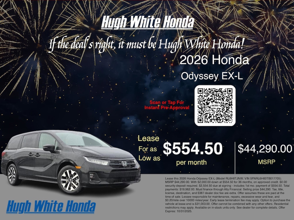 If the deal's right, it must be Hugh White! Stop in today and see why thousands of customers have trusted us with their new vehicles over the years! 2026 Honda Odyssey Crystal Black Pearl
