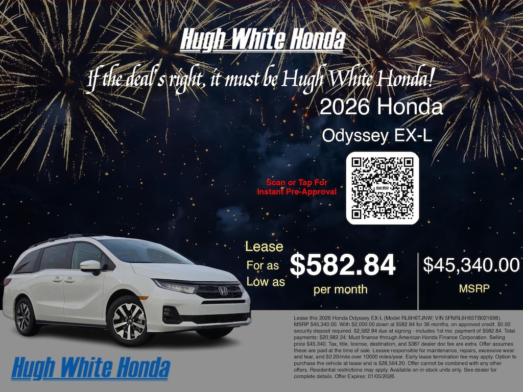 If the deal's right, it must be Hugh White! Stop in today and see why thousands of customers have trusted us with their new vehicles over the years! 2026 Honda Odyssey Platinum White Pearl