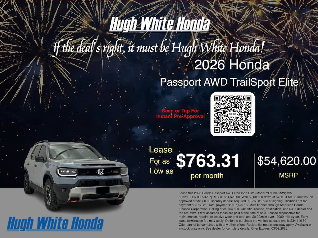 If the deal's right, it must be Hugh White! Stop in today and see why thousands of customers have trusted us with their new vehicles over the years! 2026 Honda Passport Sonic Gray Pearl