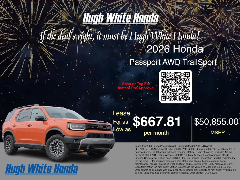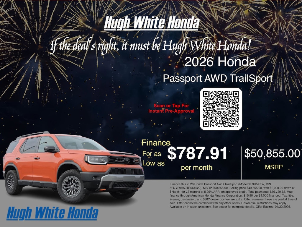 If the deal's right, it must be Hugh White! Stop in today and see why thousands of customers have trusted us with their new vehicles over the years! 2026 Honda Passport Sunset Orange