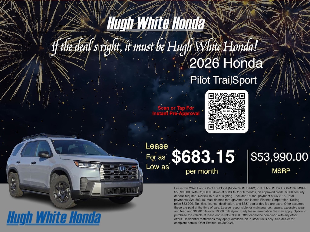 If the deal's right, it must be Hugh White! Stop in today and see why thousands of customers have trusted us with their new vehicles over the years! 2026 Honda Pilot Sonic Gray Pearl