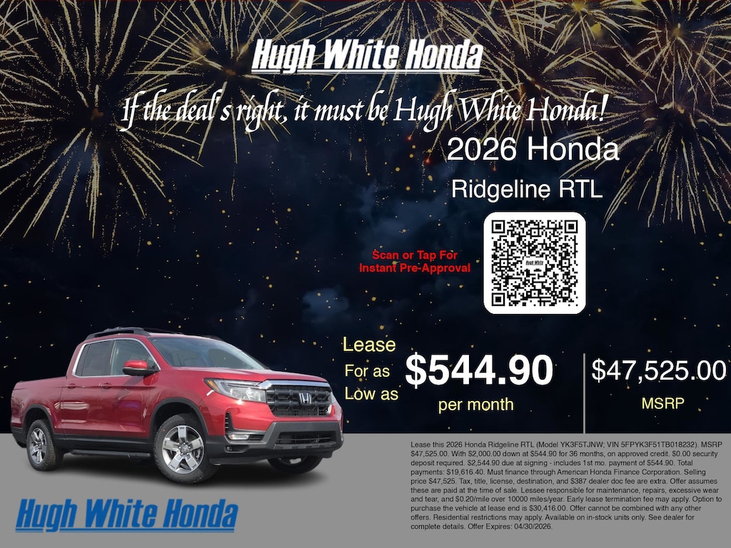 If the deal's right, it must be Hugh White! Stop in today and see why thousands of customers have trusted us with their new vehicles over the years! 2026 Honda Ridgeline Radiant Red Metallic II