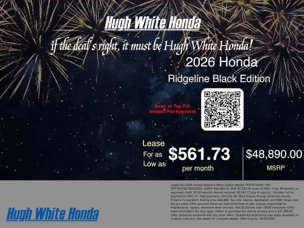 If the deal's right, it must be Hugh White! Stop in today and see why thousands of customers have trusted us with their new vehicles over the years! 2026 Honda Ridgeline Crystal Black Pearl