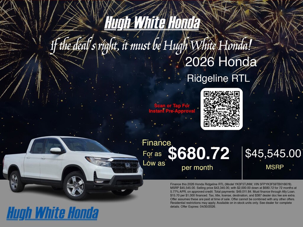 If the deal's right, it must be Hugh White! Stop in today and see why thousands of customers have trusted us with their new vehicles over the years! 2026 Honda Ridgeline Platinum White Pearl