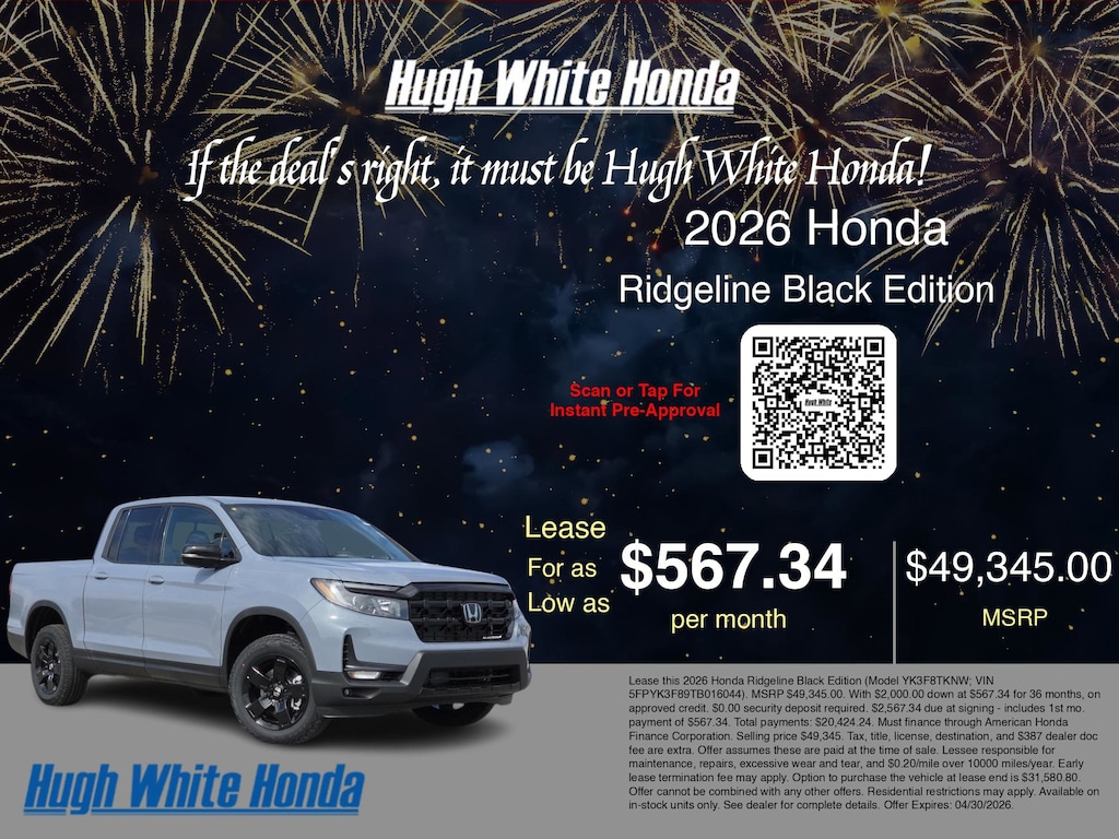 If the deal's right, it must be Hugh White! Stop in today and see why thousands of customers have trusted us with their new vehicles over the years! 2026 Honda Ridgeline Gray