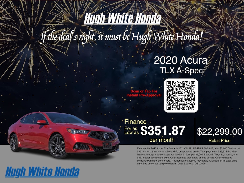Disclaimer: Finance this 2020 Acura TLX Stock 14737, VIN 19UUB2F64LA004815, with $2,000.00 down at $351.87 for 72 months at 7.59% APR, on approved credit. Total payments: $25,334.64. Must finance through a dealer-approved lender. $15.78 per $1,000 financed. Tax, title, license, and $387 dealer doc fee are extra. Offer assumes these paid at time of sale. Offer cannot be combined with any other offers. Residential restrictions may apply. Available on in-stock units only. See dealer for complete details. Offer Expires: 10/31/2025.