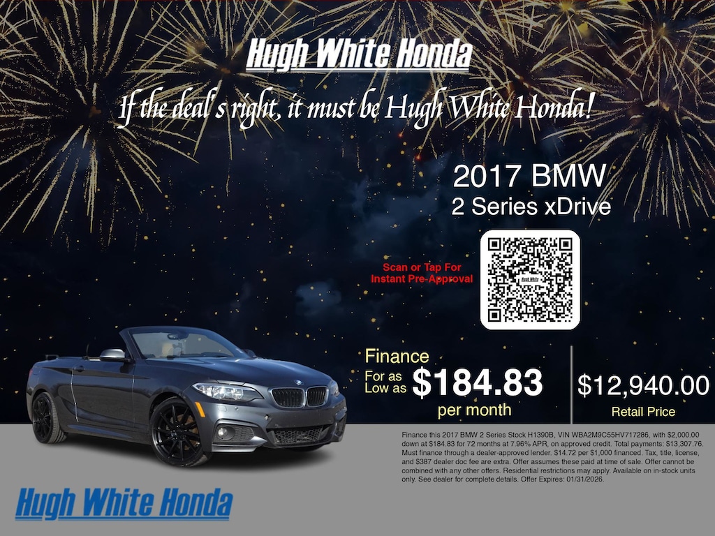 If you're ready to finance a used Honda vehicle near Columbus, Grove City, Hilliard, and Canal Winchester, Hugh White Honda is thrilled to offer you a competitive finance offer on this 2017 BMW 2 Series xDrive. Use our car payment calculator to estimate your monthly payments or see how the monthly payment of $184.83 is calculated for well-qualified buyers shopping at Hugh White Honda with Tier 1 credit: